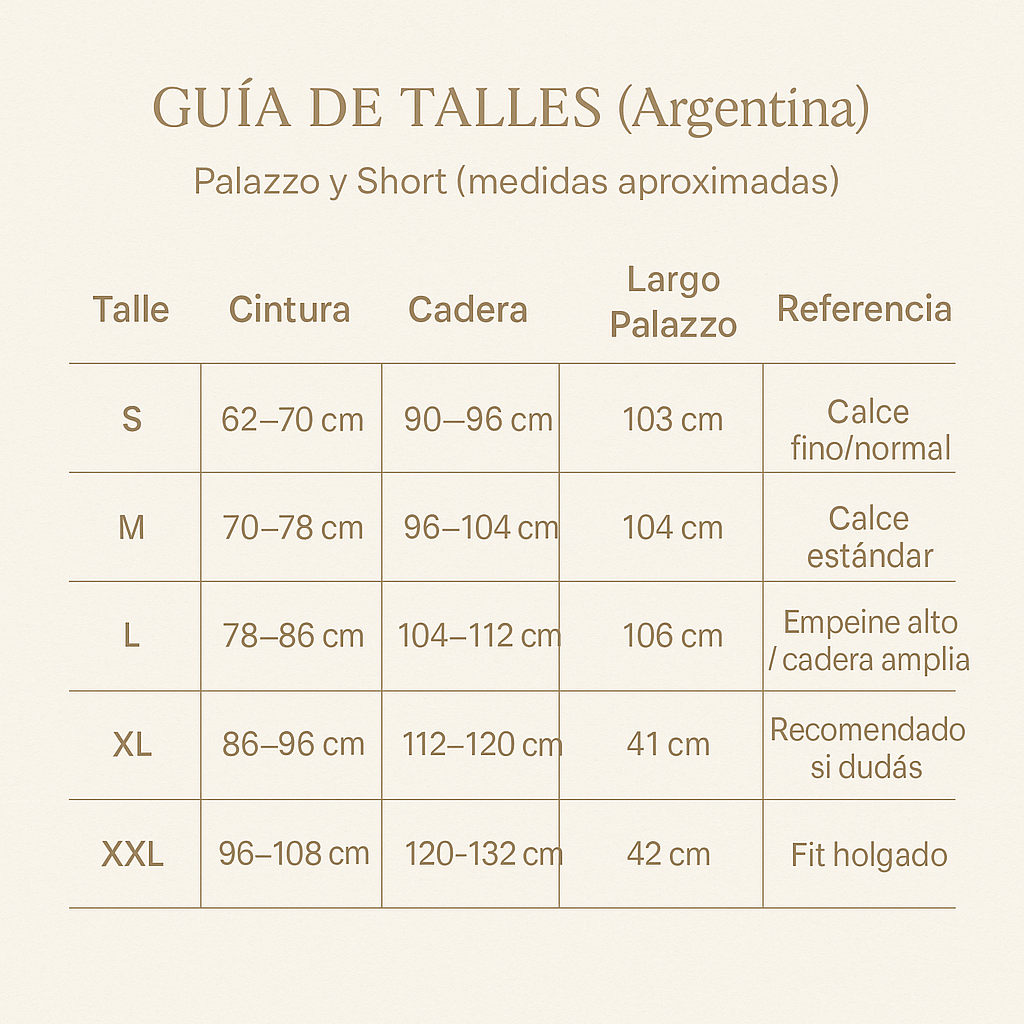 | Talle | Cintura | Cadera | Largo Palazzo | Largo Short | Referencia |