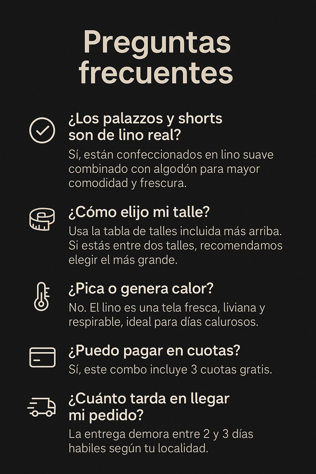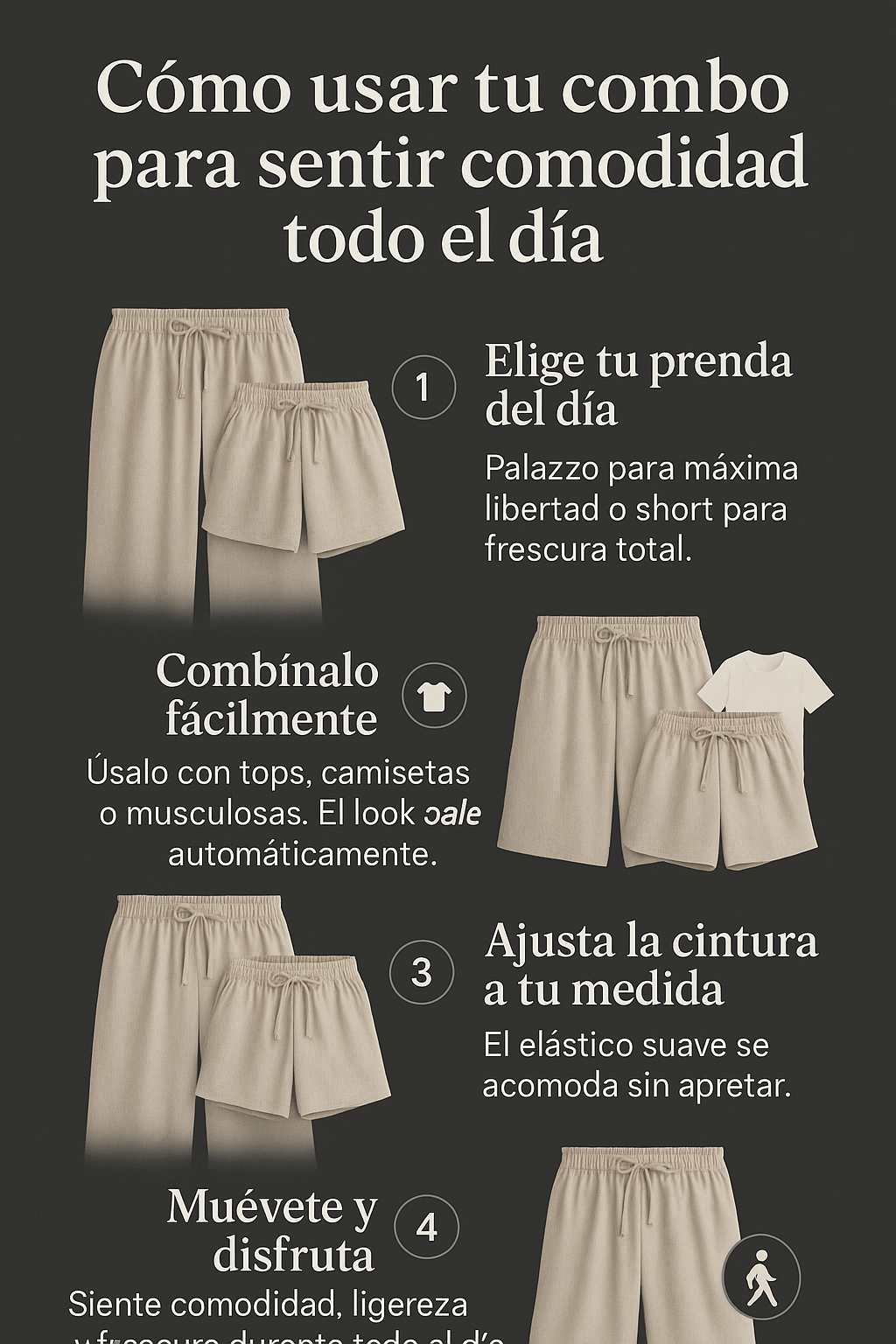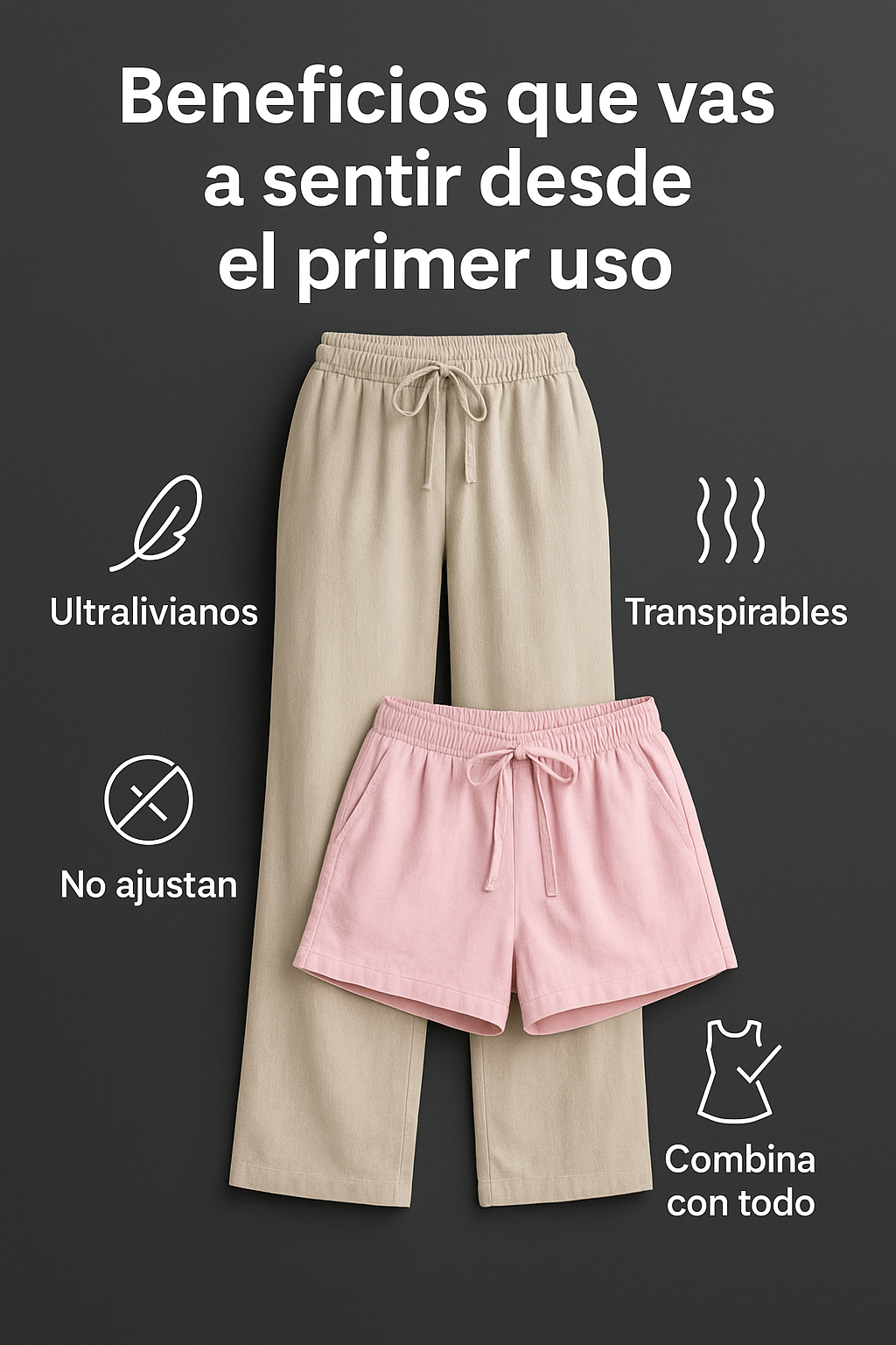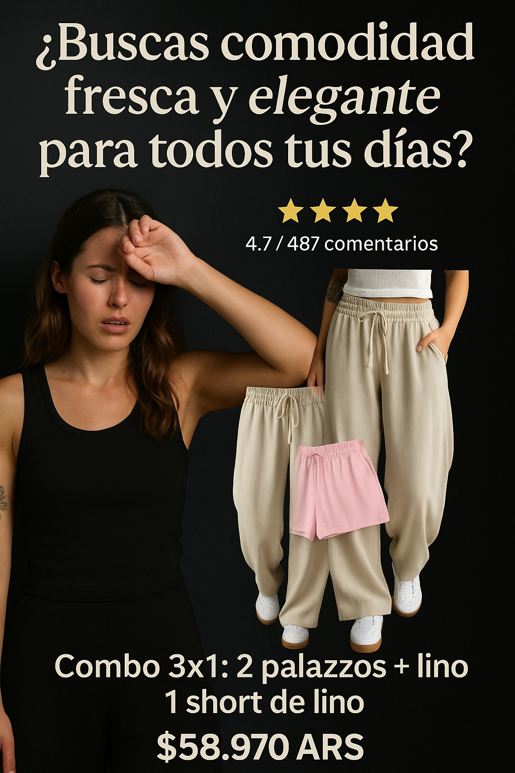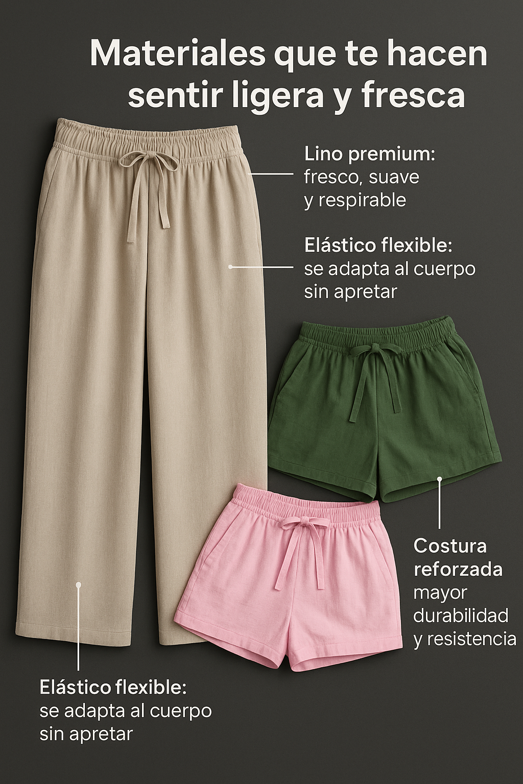 Nuestro Combo 3x1 Premium incluye 2 palazzos de lino + 1 short de lino, confeccionados en una mezcla suave, ligera y respirable ideal para el clima argentino.