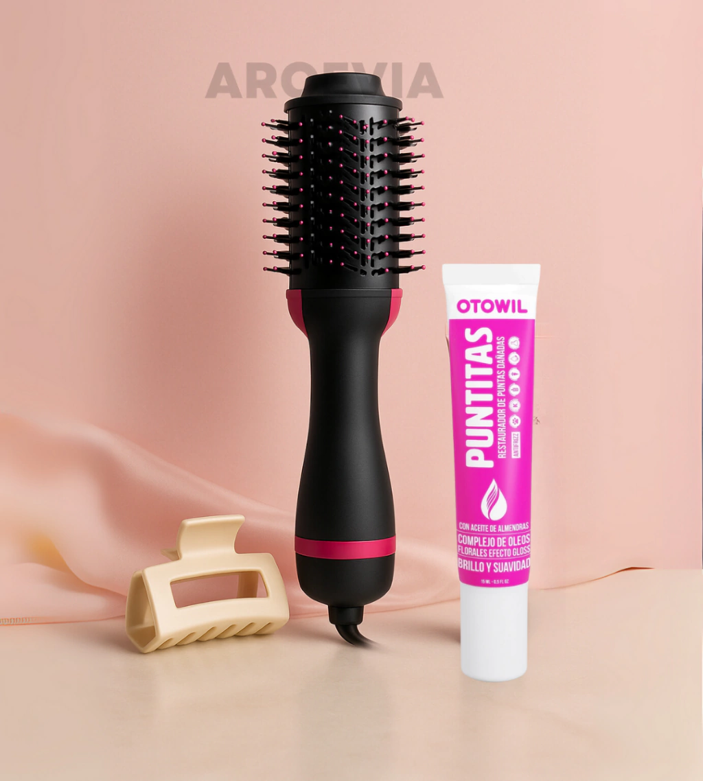 El Glow Express 3 en 1 reúne tus básicos de rutina capilar en un solo pack: cepillo secador para secado y peinado rápido con acabado prolijo, broche tipo claw clip que sujeta sin marcar, y aceite reparador que sella puntas y aporta brillo. Diseñado para que salgas peinada y lista en pocos minutos, con un look natural y anti-frizz, todos los días.