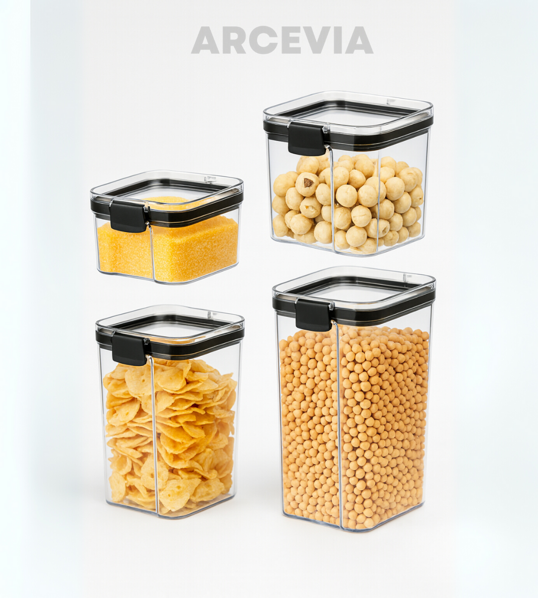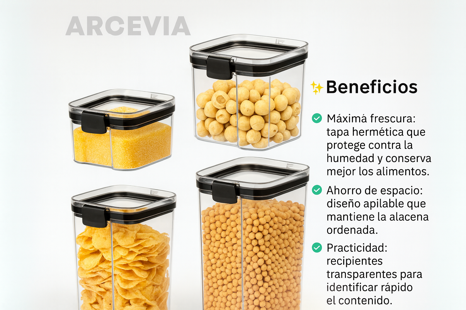 Este set de 4 recipientes herméticos acrílicos es la solución ideal para mantener tu cocina y alacena ordenada, moderna y libre de humedad. Gracias a su diseño apilable y transparente, podés identificar el contenido de un vistazo y optimizar al máximo tus espacios.